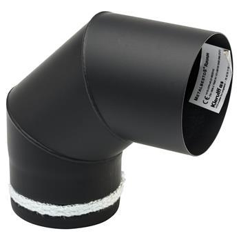 Metalbestos knærør uden renseklap med smig og keramisk pakning Til fastbrændsels- og oliefyrede kedler med røggastemperaturer større end 120 og mindre end 400 °C. Som forbindelsesrør (røgrør) mellem kedel eller brændeovn og skorsten. Sorte røgrør må ikke anvendes til anlæg med kondenserende drift eller anlæg, hvor kondensdannelse i forbindelsesrør eller skorsten ikke kan udelukkes. Sorte røgrør er brandmodstandsdygtige og skal monteres med enafstand til brændbare bygningsdele, som angivet i Bygningsreglementet. Vandrette røgrør 300 mm, lodrette røgrør 225 mm og renselemme 200 mm iht. BR10.