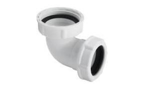 Afgangsvinkel 1¼" x 32 mm. i hvid plast. Bruges under håndvasken. Med omløber, spændering og pakning