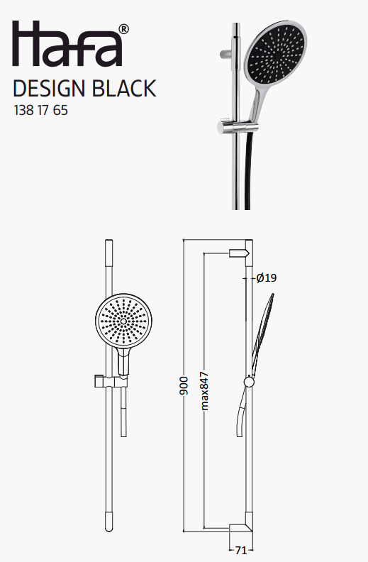 Hafa Design brusesæt - Krom/sort Bruseset i krom og sort med brusestang i metal. Sort bruserslange med AntiTwist og ekstra stort brusehoved Ø 170. Brusestang med justerbare vægbeslag 350-847 mm. Brusesetet indeholder sæbeskål.