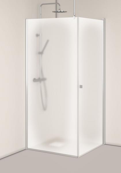 En fast brusevæg og en svingbar dør monteret i hjørne eller i nische.