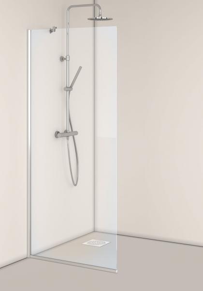 Monteringsvenlig fast lige brusevæg med limbar profil i aluminium. Brusestangen kan monteres på tre måder: på væggen, i loftet eller vinkelret på samme væg, hvor bruseren monteres. Stangen er 1200 mm og kan afkortes til en valgfri længde. Vendbar. 8 mm hærdet sikkerhedsglas. Højde 2000 mm. Der fås en forlængelsesprofil til udvendige rør.