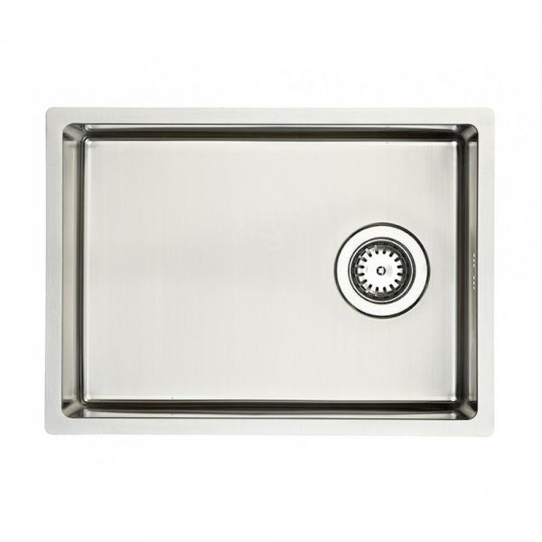 Rustfri stålvask, uden hanehul, i moderne firkantet design. De indvendige runde hjørner følger vaskens yderkant, hvilket giver et harmonisk design, ligeledes er de indvendige runde hjørner rengøringsvenlige.