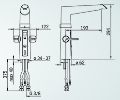 Køkkenarmatur med betjeningsvenlige greb til varm og kold vand, berøringsfri funktion, høj svingtud og perlator. Det varme og kolde vand justeres på separate greb. Tudens svingradius er forindstillet til 120° (kan begrænses til 60° eller 80°). Den berøringsfri funktion aktiveres ved, at holde hænderne indenfor sensoromådet. Vandtemperaturen på den berøringsfri funktion justeres ved, at dreje ringen mellem armaturet om svingtuden. Den berøringsfri funktion kan let slås til/ fra. Batteridrevet, 3 V. Armaturet er udstyret med smudsfiltre.