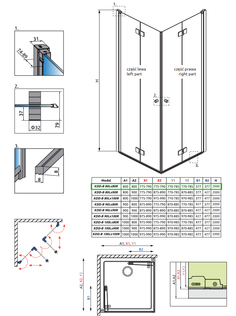 Strømberg Noma 110 bruseniche m/foldedøre - 80x80 cm - Klar glas/børstet gunmetal