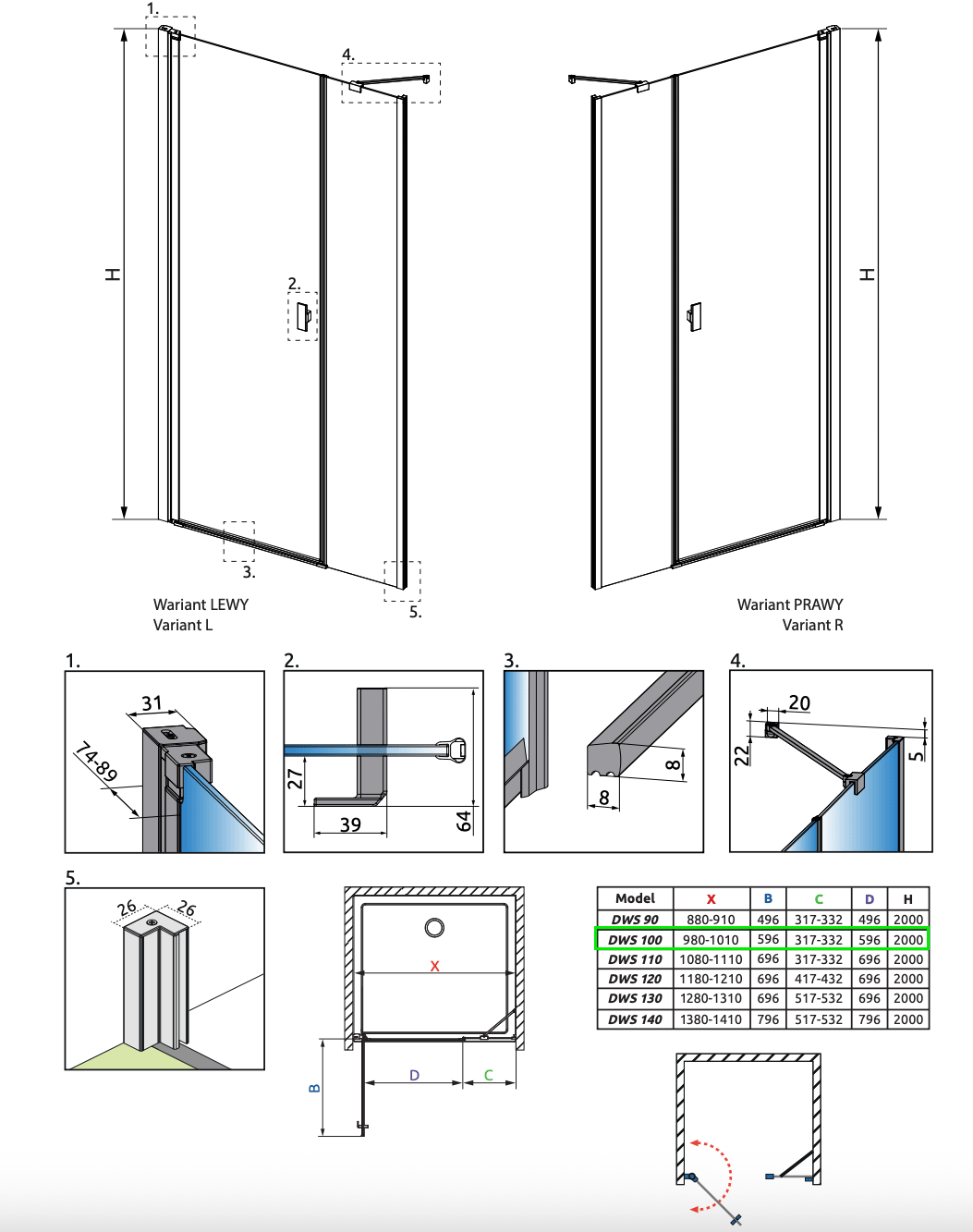 Strømberg Noma 45 svingdør m/sidepanel 1000mm - Venstre - Børstet messing Brusenichedør med fast sidepanel - begge med paneler og greb på døren i børstet messing PVD. Specifikationer: