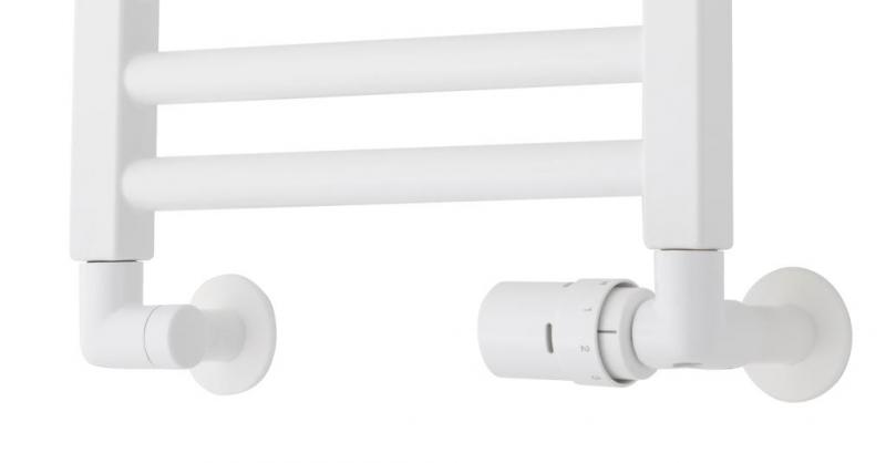 TVS Ventilsæt type 120 m/returtermostat, højre, vinkelløbende - Hvid Retur ventilsæt type 120 er vinkel ventilsæt med retur termostat som bruges når man skal have sin håndklædetørrer monteret på central- / fjernvarmesystemet. Brugen af denne type ventil kræver at der kommer rør ud fra væggen. Man vil typisk bruge denne type ventil hvis man ønsker en løsning hvor man jævnligt gerne vil stille på temperaturen. Denne type ventil anbefales til fjernvarme. Reguleringen er termostatstyret og dette gør den nem at indstille til den ønskede temperatur. Termostaten skal sidde på den side hvor returvandet kommer. Termostaten vil så sørge for at vandet i håndklædetørreren har en fast og ensartet temperatur. Type 120 og 220 er til de varmesystemer hvor returvandet kommer i højre siden og type 121 og 221 er til venstre side. Til disse ventilsæt medfølger rør afdækninger med rosetter i samme overflade Specifikationer: