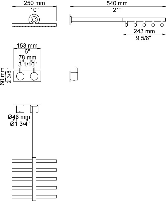 Vola Indbygningstermostat med løs afgangsmuffe Vægmonteret hovedbruser Krom 16 3/4''RG/PEX