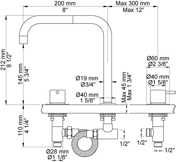 Vola To-grebsblander bestående af 2 stk keramiske stopventiler Dobbelt svingbar udløb, 200 mm, ø19 mm Standard 25 mm Rosetter Krom 16 ½''RG |